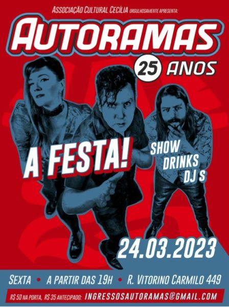 Com muita história e música nas últimas duas décadas e meia, a banda Autoramas se prepara para comemorar a data festiva com show mais do que especial no dia 24 de março, na Associação Cultural Cecília, em São Paulo. Fundada e liderada pelo guitarrista, vocalista e compositor Gabriel Thomaz, Autoramas é pedra fundamental da cultura rock brasileira, tendo atravessado os anos se mantendo relevante e desafiando as diversas mudanças do mercado musical. A banda, hoje integrada por Érika Martins (vocais, guitarra, teclado e pandeirola) e Jairo Fajer (baixo), pode ser considerada uma das mais longevas e interessantes em termos de criatividade musical, sendo uma referência para inúmeros grupos de garagem que surgiram no país a partir dos anos 1990.
