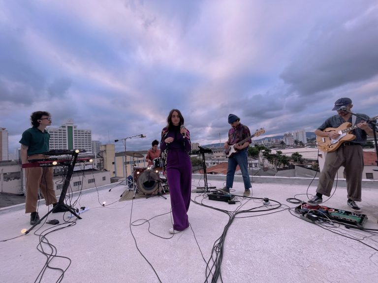 Gravada na cobertura da Fauhaus (SP), debaixo de um céu cinza e arroxeado típico de um fim de tarde paulistano, a artista canta suas composições que dialogam sobre relacionamentos e vivências pessoais. Após começar com uma versão para a clássica “A sua”, de Marisa Monte, única releitura do projeto de vídeos, e apresentar um dos destaques de seu repertório autoral com “eu em tu, tu em mim”, ela lança “Banjo com agogô”.
