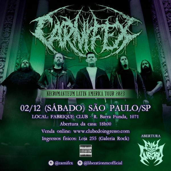 A inédita e esperada apresentação da banda norte-americana Carnifex em São Paulo, dia 2/12 (no Fabrique Club),com abertura do quarteto metal/hardcore paulista Fim da Aurora. A turnê, que passa por outros países da América Latina, é uma realização da Liberation Tour Booking. Além da capital paulista, o Carnifex faz um segundo e último show no Brasil no dia 3 de dezembro, em Piracicaba, com produção da Hardcore Pride.