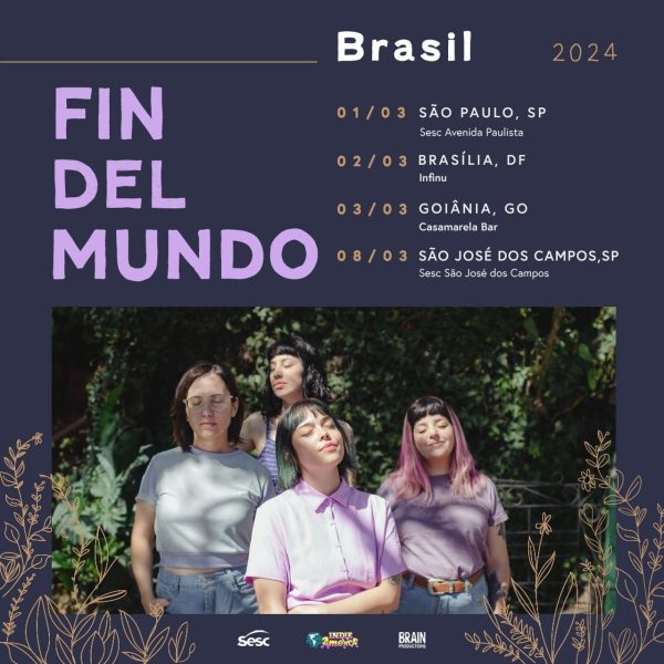 Mais dois shows acabam de ser anunciados na inédita turnê da banda argentina Fin del Mundo pelo Brasil em março: o quarteto feminino de rock alternativo também se apresentará dia 2/03 em Brasília (DF), no Infinu, e dia 3/03 em Goiânia (GO), no Casamarela Bar, além dos anteriormente anunciados shows em São Paulo (1/03, no Sesc Avenida Paulista) e em São José dos Campos (8/03, Sesc São José dos Campos).