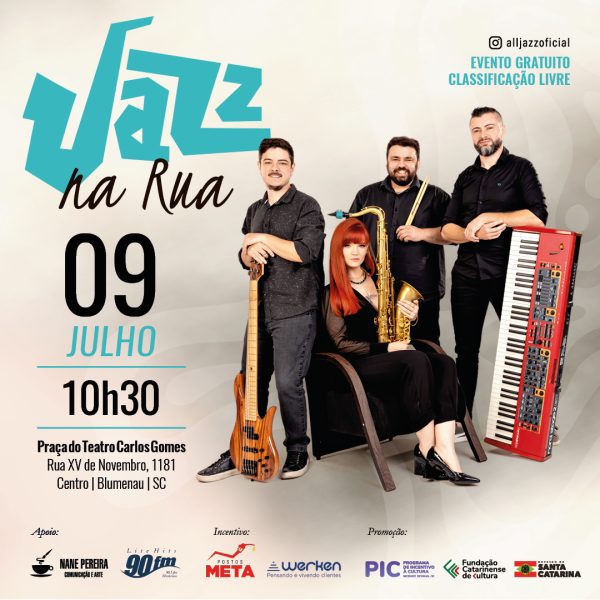 Neste domingo, dia 9 de julho, às 10h30, ocorre a segunda apresentação do projeto Jazz na Rua, na praça do Teatro Carlos Gomes, em Blumenau.